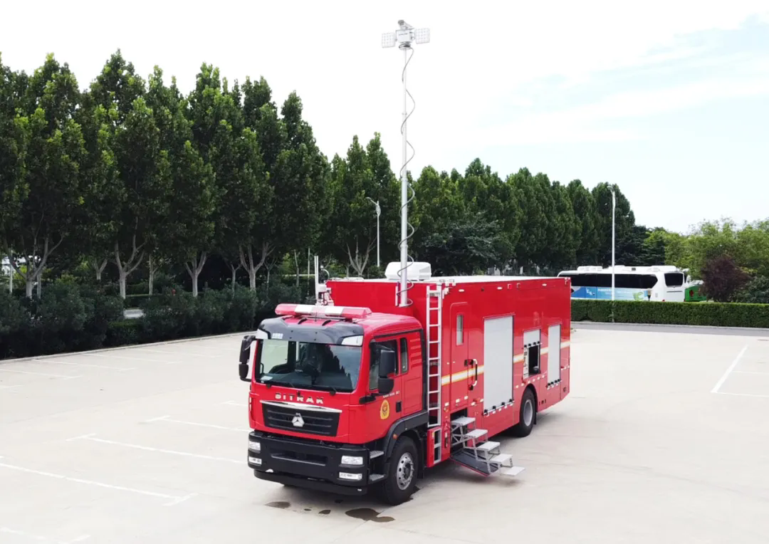 猎鹰应急救援消防车是猎鹰无人机灭火及应急救援综合装备的重要组成部分,其采用二类特种作业车底盘,上装设置有操控舱、器材舱、无人机起降平台、液压尾板等专业设施,并搭载有系留高压液体灭火系统、系留A类压缩空气泡沫灭火系统、储压罐体灭火系统等灭火救援功能模块,高空照明、物资运输、山地救援、水域救援等应急救援功能模块和系列无人机飞行平台,可为无人机灭火救援、抢险救援提供多种作业支撑和战力保障。